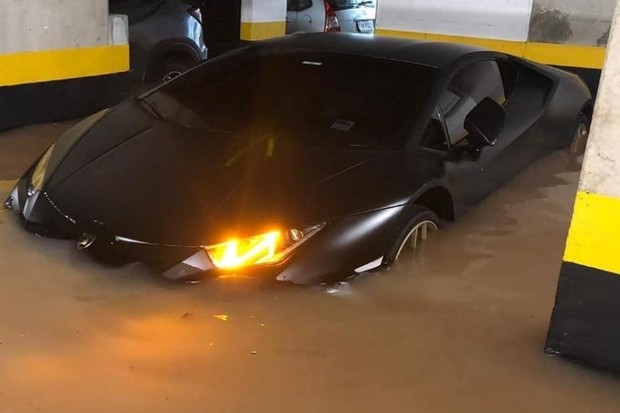 Em vídeos e fotos que circulam nas redes sociais é possível ver um Lamborghini Huracán 2015 com metade de sua carroceria submersa pelas águas.