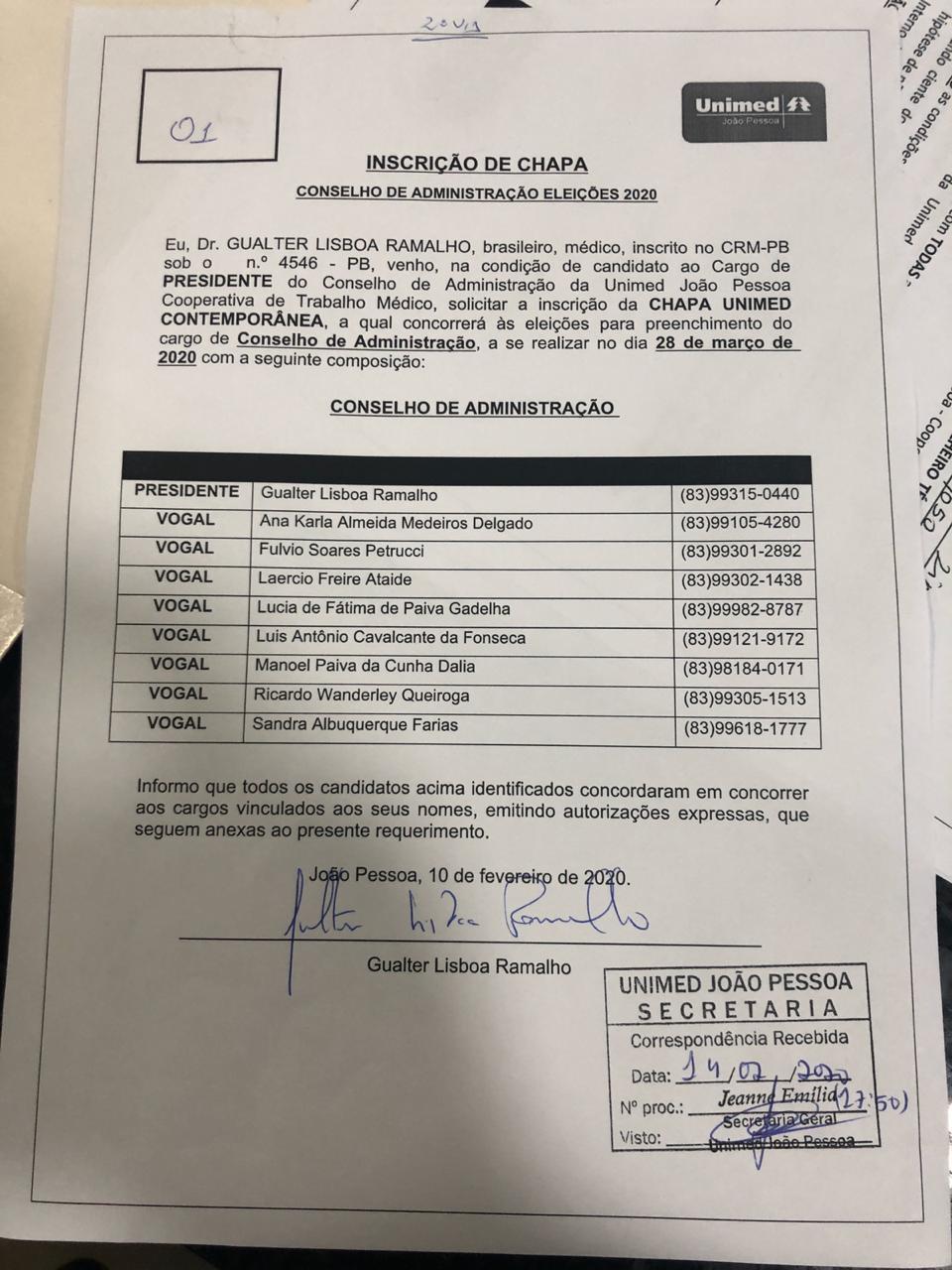 O grupo ficou registrado como “Chapa 1 – Unimed Contemporânea”, e tem Gualter Ramalho como candidato à presidente da Unimed João Pessoa, e outros oito médicos na disputa pelas vagas de conselheiros vogais da Cooperativa.