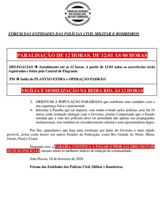 As Polícias Civil, Militar e o Corpo de Bombeiros da Paraíba anunciaram, na noite desta terça-feira (18), uma paralisação de suas atividades durante um período de 12h. A mesma acontece em meio a realização de uma Assembleia Geral Unificada com o objetivo de discutir um maior percentual de reajuste salarial para as categorias.