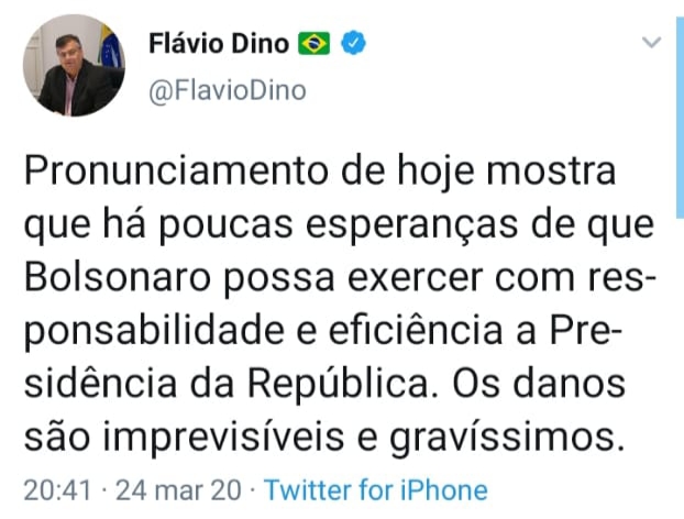 O governador do Maranhão, Flávio Dino (PCdoB), reagiu na noite desta terça-feira (24), por meio de sua conta no Twitter, para declarar que a atuação do presidente Jair Bolsonaro (Sem partido) na conjuntura política e administrativa do país vem se agravando por demonstração de incapacidade no trato de sérios problemas do Brasil apontando “danos imprevisíveis e gravíssimos” .