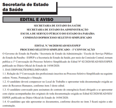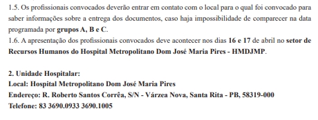 Segundo a publicação, o Grupo A, formado por enfermeiros, médicos e médicos intensivistas que devem se apresentar no setor de Recursos Humanos do Hospital Metropolitano Dom José Maria Pires, em Santa Rita, na manhã desta quinta-feira para apresentação da documentação exigida no edital. Já o Grupo B, formado por assistentes sociais, auxiliares de farmácia, farmacêuticos, fisioterapeutas, maqueiros, nutricionista e psicólogos, devem se apresentar ao RH na tarde desta quinta.