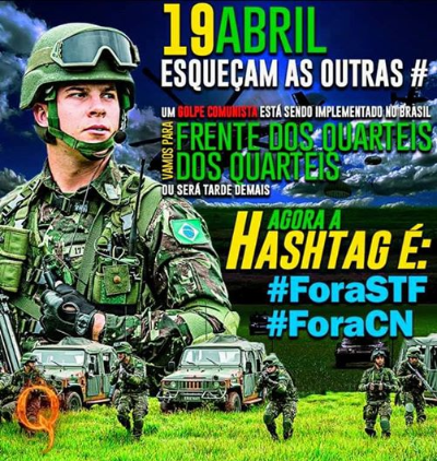 Nas redes sociais, o ato está marcado para o dia 19, Dia Do Exército, em frente aos quartéis de todo o país, quebrando recomendações de quarentena decretada por quase todos os governos estaduais e municipais.
