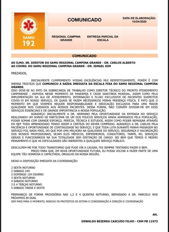 A Secretaria de Saúde de Campina Grande se pronunciou sobre o caso e apontou que o profissional Oswaldo Bezerra Cascudo Filho pediu desligamento das suas funções no Samu no último dia 10 de abril.