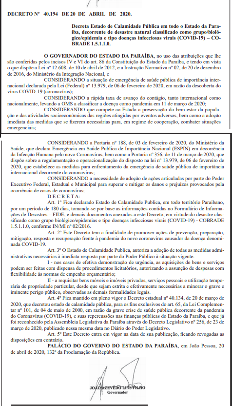 Art. 1º Fica declarado Estado de Calamidade Pública, em todo território Paraibano,