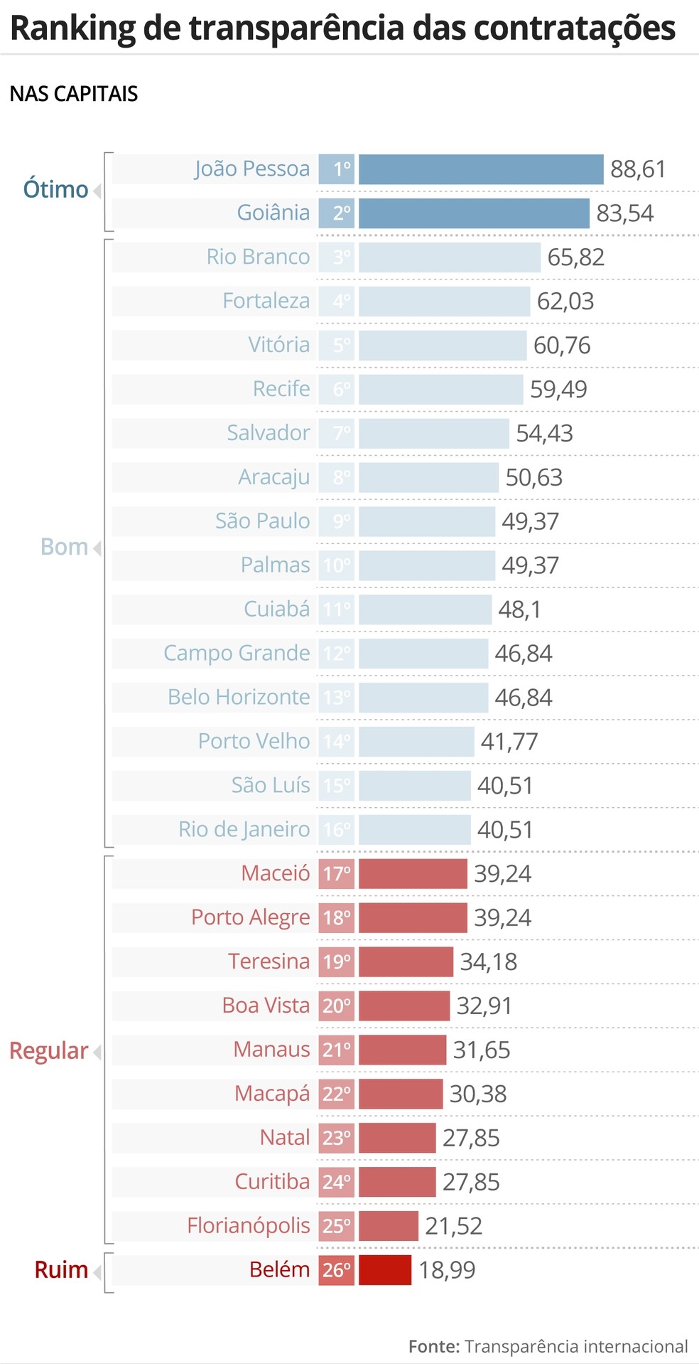 O ranking aponta ainda que das prefeituras que têm menos recursos e equipes de transparência, segundo a ONG, só cinco tiveram nota boa ou ótima. Outras nove tiveram nota ruim. Belém foi a única com avaliação péssima, de 0 a 19. Cerca de metade dos estados recebeu nota boa ou ótima, entre 79 e 100. Dos restantes, apenas São Paulo e Roraima tiveram nota ruim, de 20 a 39.