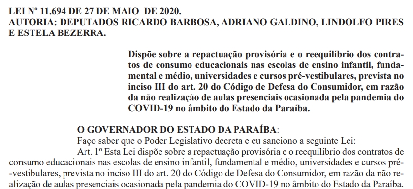 De acordo com a publicação, a Lei dispõe sobre a repactuação provisória e o reequilíbrio dos contratos de consumo educacionais nas escolas de ensino infantil, fundamental e médio, universidades e cursos pré- -vestibulares.