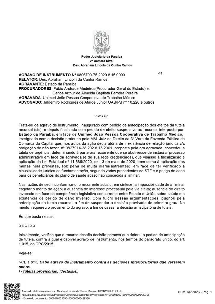 O desembargador Abraham Lincoln da Cunha Ramos, da 2ª Câmara Cível de João Pessoa, negou o recurso do Estado da Paraíba e manteve a decisão que isenta a Unimed João Pessoa de atender pacientes do Sistema Único de Saúde (SUS) acometidos pelo novo coronavírus.