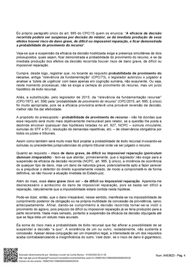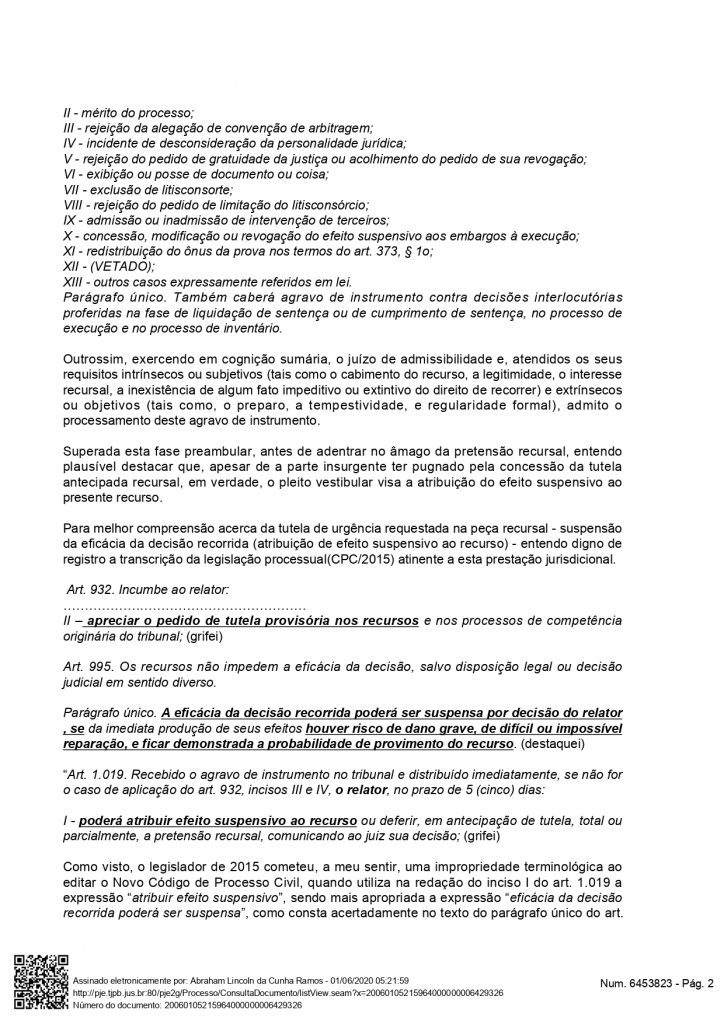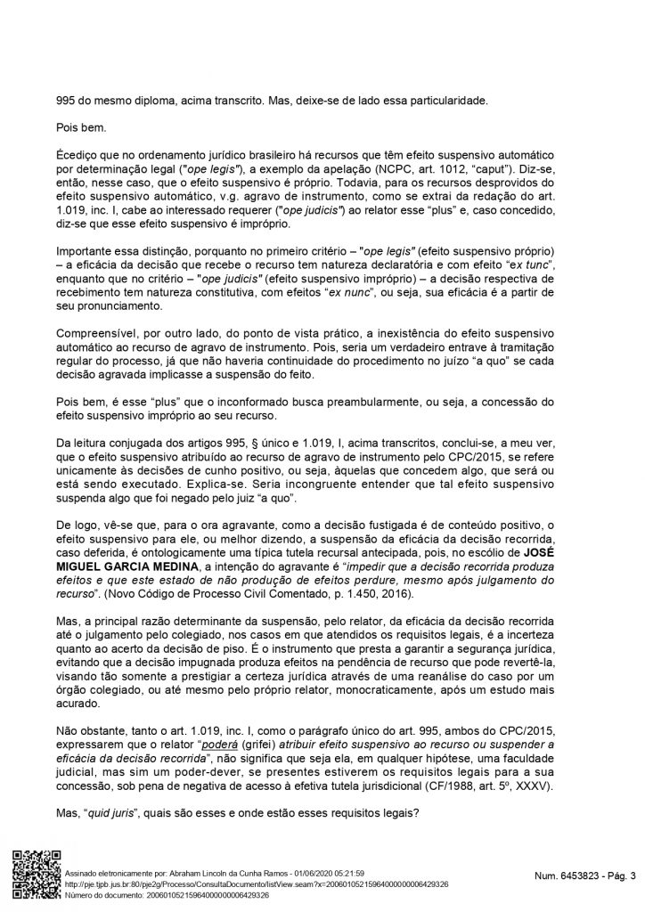 “Diante desse quadro, e no exercício da cognição sumária, não exauriente, apropriada a esta fase processual, como dito acima, ante à virtual ausência de probabilidade de provimento do recurso e de risco de dano grave, de difícil ou impossível reparação (CPC, art. 995), bem como do dano inverso, registrando que a não concessão do pedido liminar não implica, necessariamente, na antecipação do julgamento, INDEFIRO O PEDIDO DE EFEITO DE EFEITO SUSPENSIVO AO PRESENTE RECURSO, ou seja, A SUSPENSÃO DA EFICÁCIA DA DECISÃO AGRAVADA“, diz trecho da decisão.