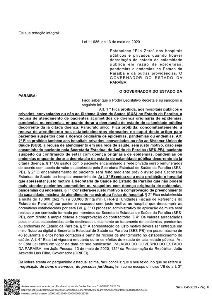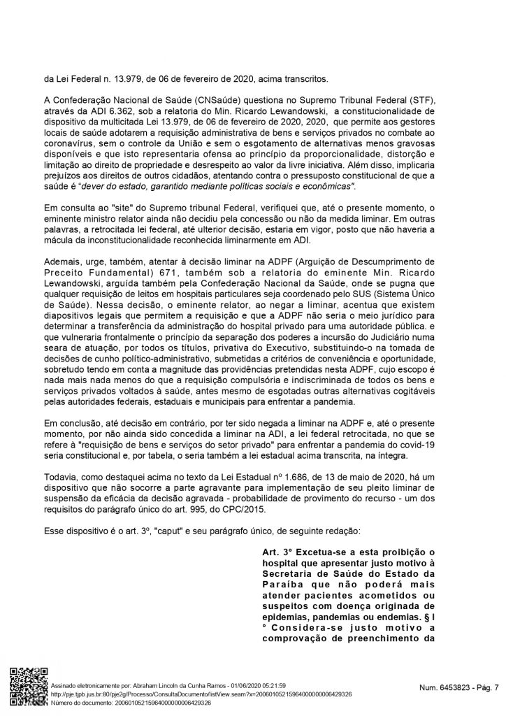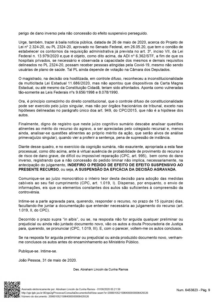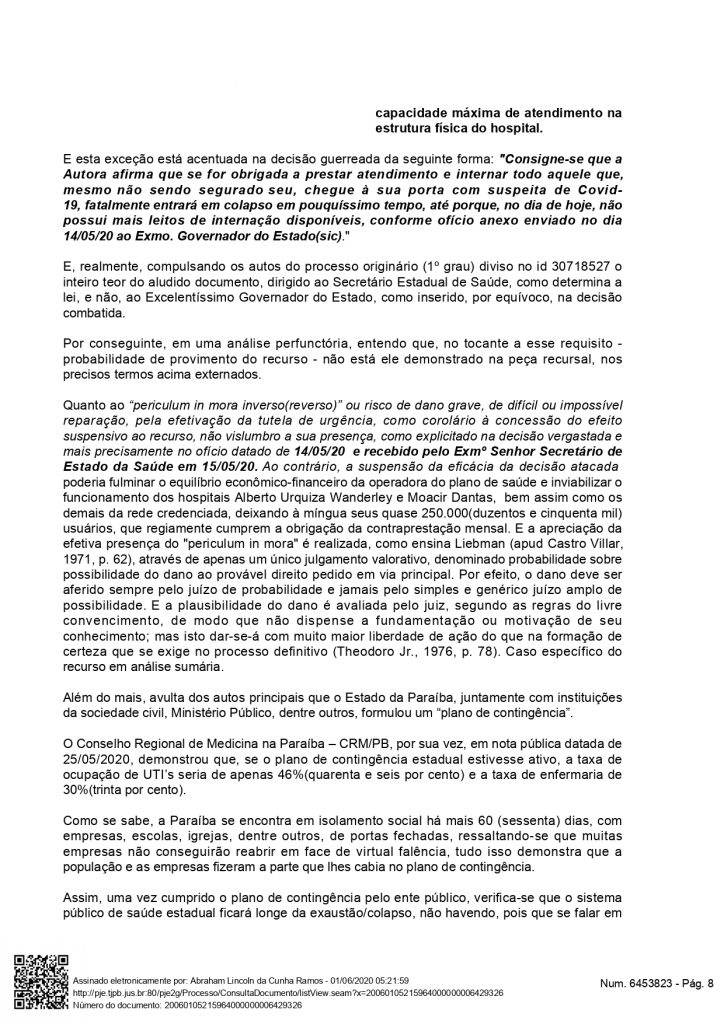 Na decisão, o desembargador levou em consideração que a Unimed-JP já está com o seu limite de vagas comprometido pela os seus conveniados. Além disso, Abraham Lincoln destacou que, se o plano de contenção da Covid-19 for cumprido, com a entrega de todos os leitos prometidos, não faltarão leitos na rede pública de saúde e será necessário o acometimento dos leitos da unidade privada.