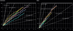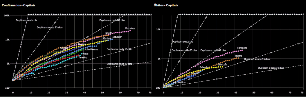 “Entretanto, este Comitê continua mantendo a posição de que ainda não é o momento propício de flexibilizar as medidas de isolamento social, uma vez que o pico da epidemia do Covid-19 não foi atingido em nenhum estado da região Nordeste, como os dois gráficos abaixo (Figuras 1 e 2) ilustram. As figuras exibem a evolução dos casos acumulados e óbitos, tanto para os estados como um todo, como também para suas capitais. Considerando os Estados, podemos notar que o número de casos novos continuam dobrando num período entre 5 e 9 dias, enquanto os óbitos dobraram entre 7 e 11 dias. No caso específico das capitais, tantos os casos como os óbitos continuam dobrando num período entre 7 e 15 dias”.