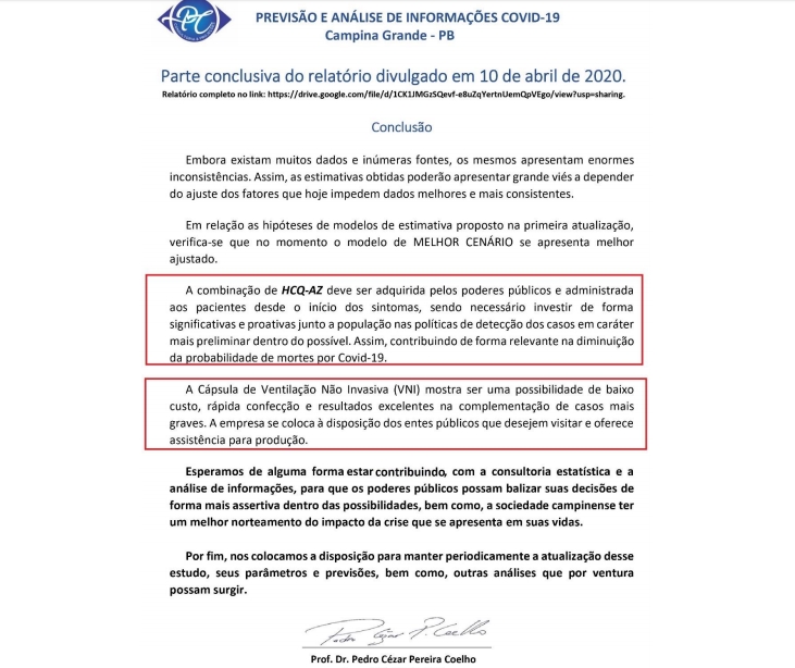 Segue imagem da parte conclusiva do relatório divulgado em 10 de Abril de 2020, que pode ser acessado na