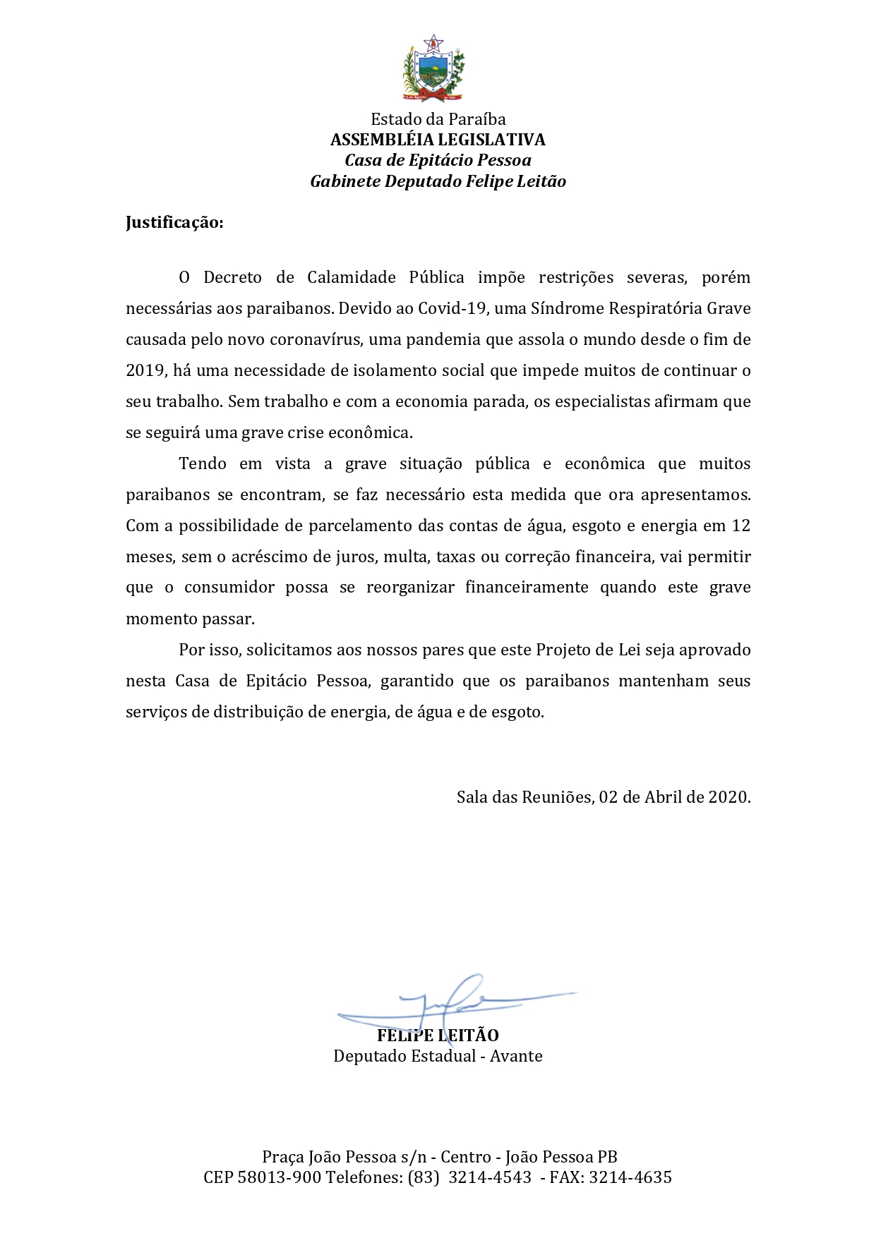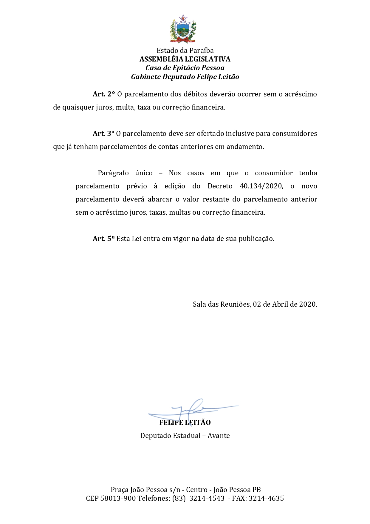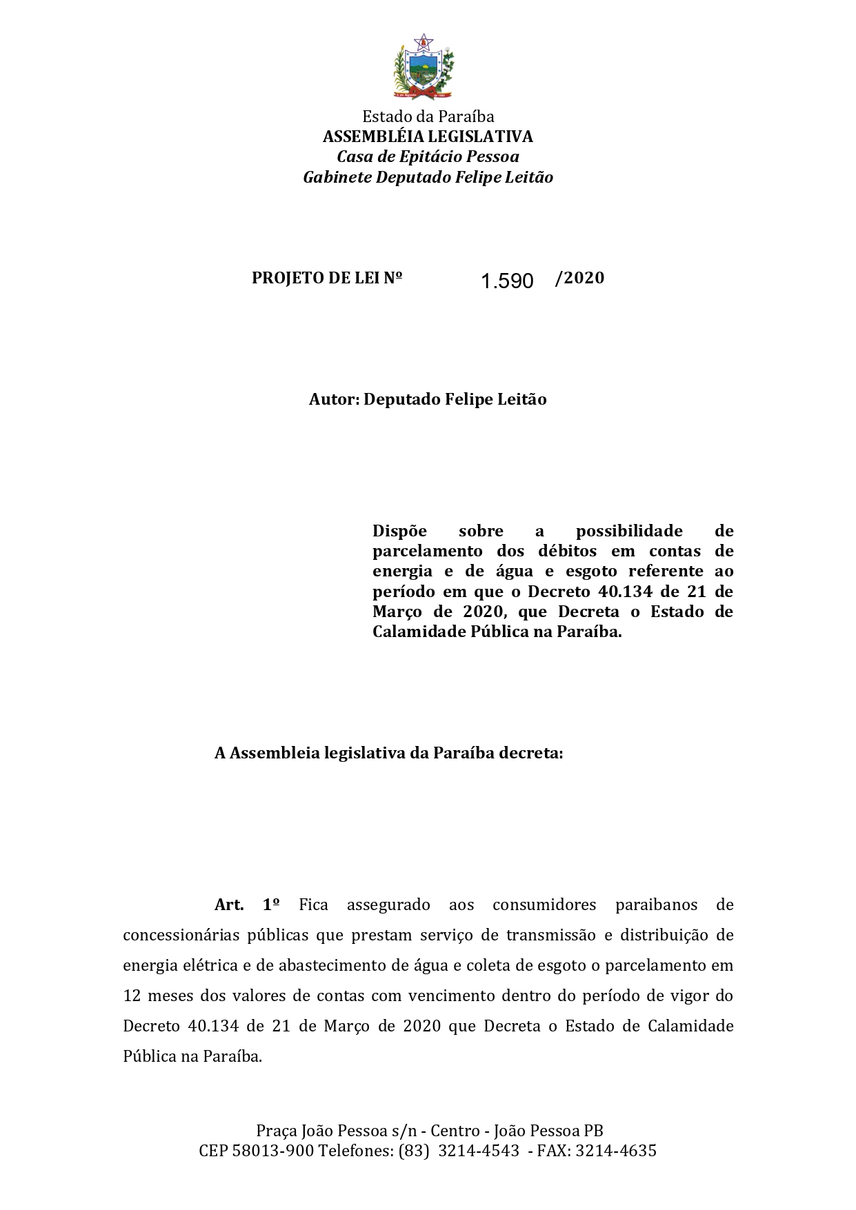 A Assembleia Legislativa da Paraíba (ALPB) aprovou, durante sessão remota nesta terça-feira (9), o Projeto de Lei 1.590/2020, de autoria do deputado Felipe Leitão (Avante), que prevê a possibilidade de parcelamento dos débitos em contas de energia, água e esgoto referente ao período em que vigorar o Decreto Estadual 40.134, de 21 de Março de 2020.