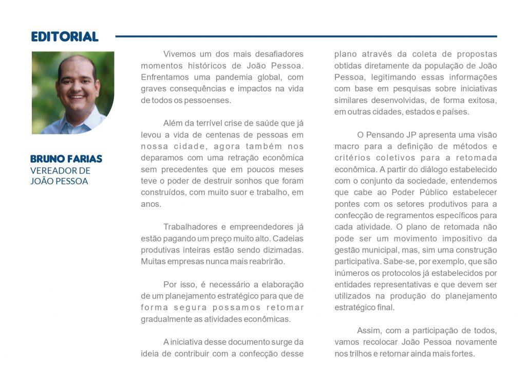 O vereador e presidente do Cidadania em João Pessoa, Bruno Farias, apresentou nesta quarta-feira (10), com colaboração da população pessoense, um Projeto de Plano de Retomada Gradual da Economia na Capital. “Vivemos um dos mais desafiadores momentos históricos de João Pessoa. Enfrentamos uma pandemia global, com graves consequências e impactos na vida de todos os pessoenses”, explica.