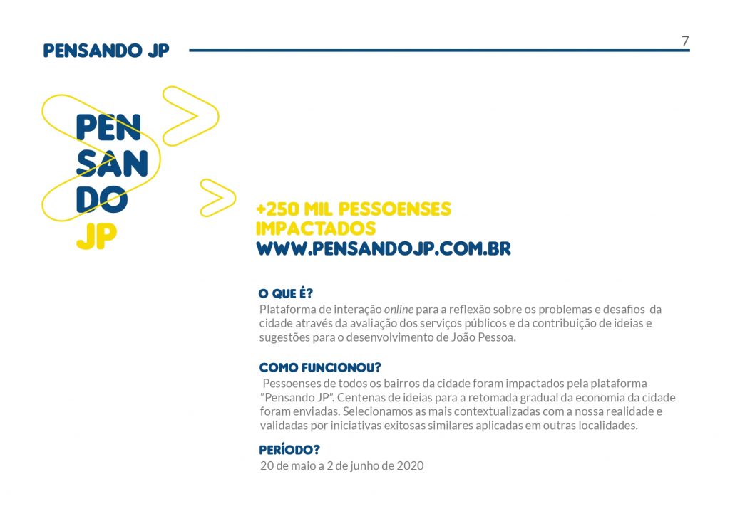 As sugestões foram enviadas através do Pensando JP (www.pensandojp.com.br), uma plataforma digital lançada por ele como um mecanismo de diálogo a fim de provocar os cidadãos, em seguida serão compiladas em um documento único que será encaminhado aos comitês de gestão de crise da Prefeitura Municipal e do Governo do Estado.