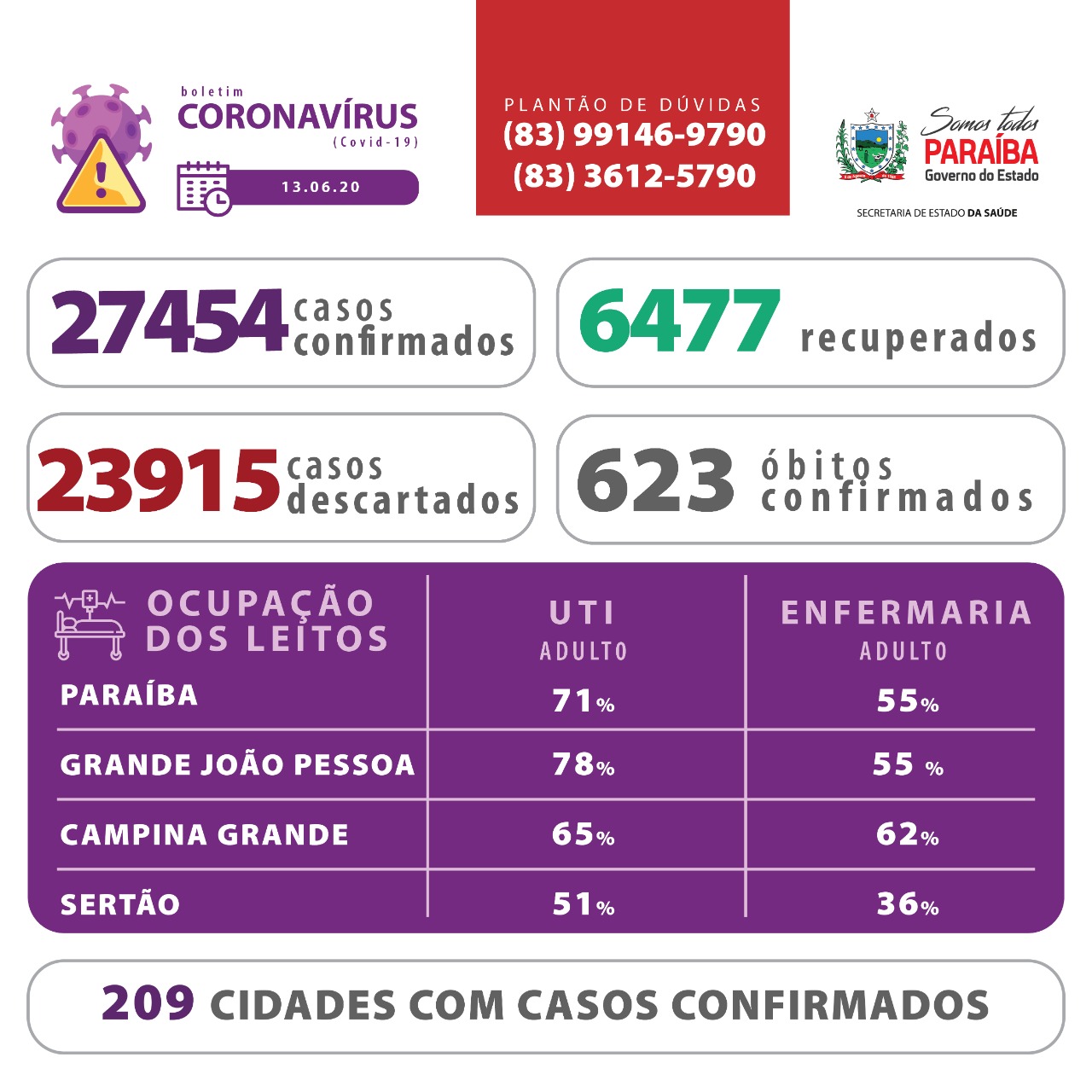 O novo boletim da Secretária de Estado da Saúde (SES) divulgado na noite deste sábado (13), aponta que a Paraíba registrou 898 novos casos de Covid-19 e 13 óbitos confirmados da doença desde a sua última atualização, sendo 4 deles ocorridos nas últimas 24h. Ao todo 27.454 pessoas que contraíram o novo coronavírus, 6.477 pacientes recuperados e 623 vieram a óbito.