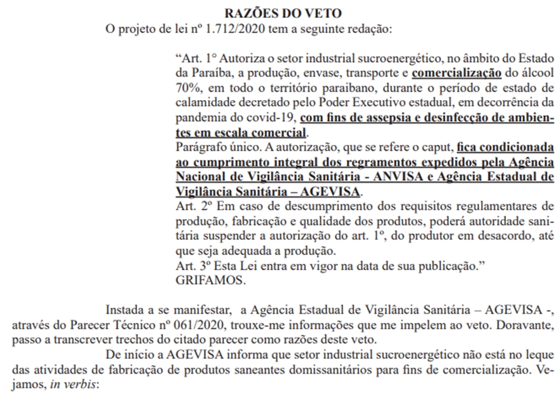 Um projeto lei de autoria do deputado estadual Buba Germano (PSB) que previa a produção, envase, transporte e comercialização de álcool 70% por parte do setor industrial da Paraíba em escala comercial foi vetado pelo governador João Azevêdo. O veto total foi publicado no Diário Oficial do Estado (DOE) desta sexta-feira (19).