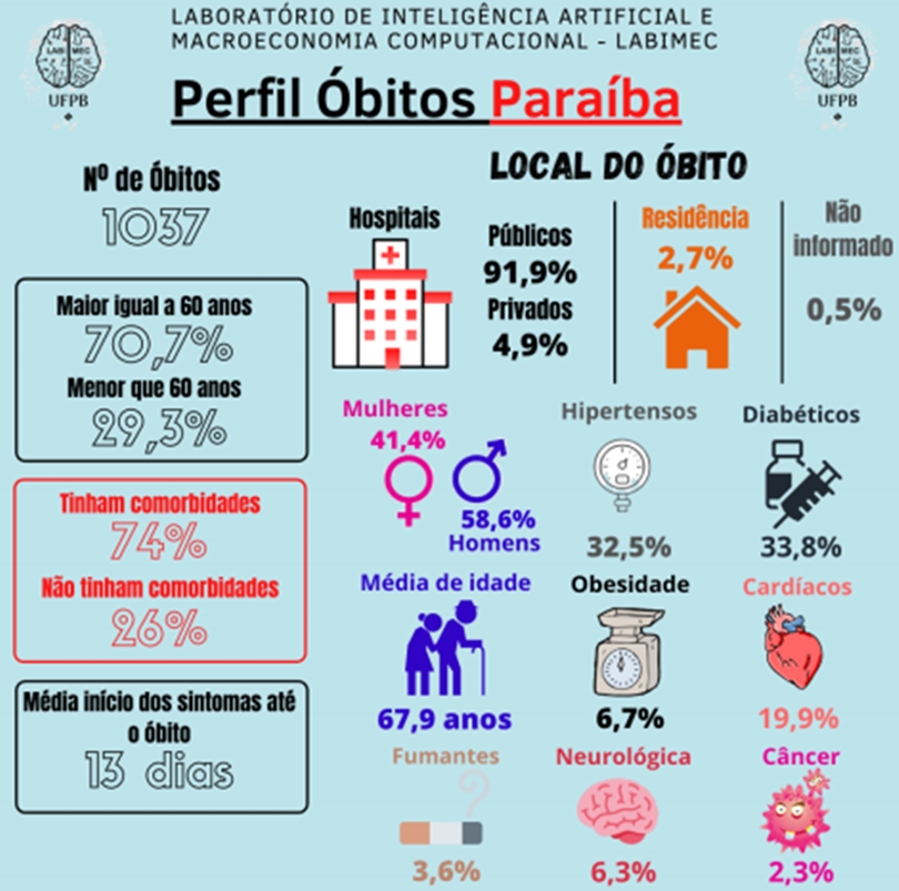 Um perfil foi construído pelo LABIMEC a partir de dados dos óbitos do novo coronavírus no Estado para o dia 02 de Julho e, a partir dele, foi possível verificar que 70,7% das vítimas tinham mais de 60 anos e 74% tinham pelo menos 01 comorbidade. As vítimas estão distribuída em 41,4% mulheres e 58,6% em homens. A média de idade foi 67,9 anos, maior que semana passada.