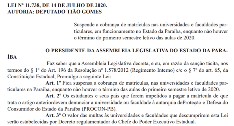 O presidente da Assembleia Legislativa da Paraíba (ALPB) Adriano Galdino (PSB), em publicação no Diário Oficial do Estado desta quinta-feira (15), promulgou a Lei 11.738, de autoria do deputado Tião Gomes (Avante), em que suspende a cobrança de matrículas nas universidades e faculdades particulares na Paraíba enquanto não houver o término das aulas do primeiro semestre letivo de 2020.