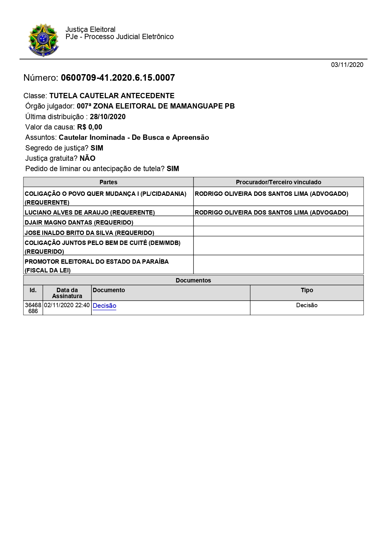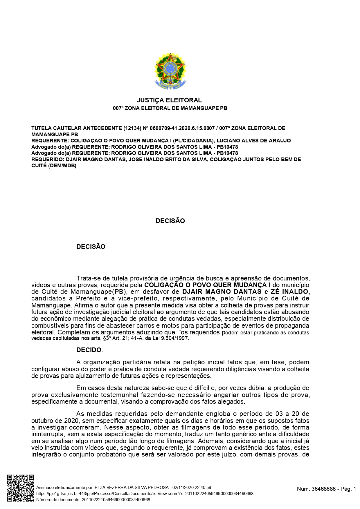 O pedido foi requerido pela ‘Coligação o Povo Quer Mudança I’, composta por PL e Cidadania, contra os candidatos Djair Magno e Zé Inaldo da Coligação ‘Juntos Pelo Bem de Cuité’, composta pelo DEM e MDB.