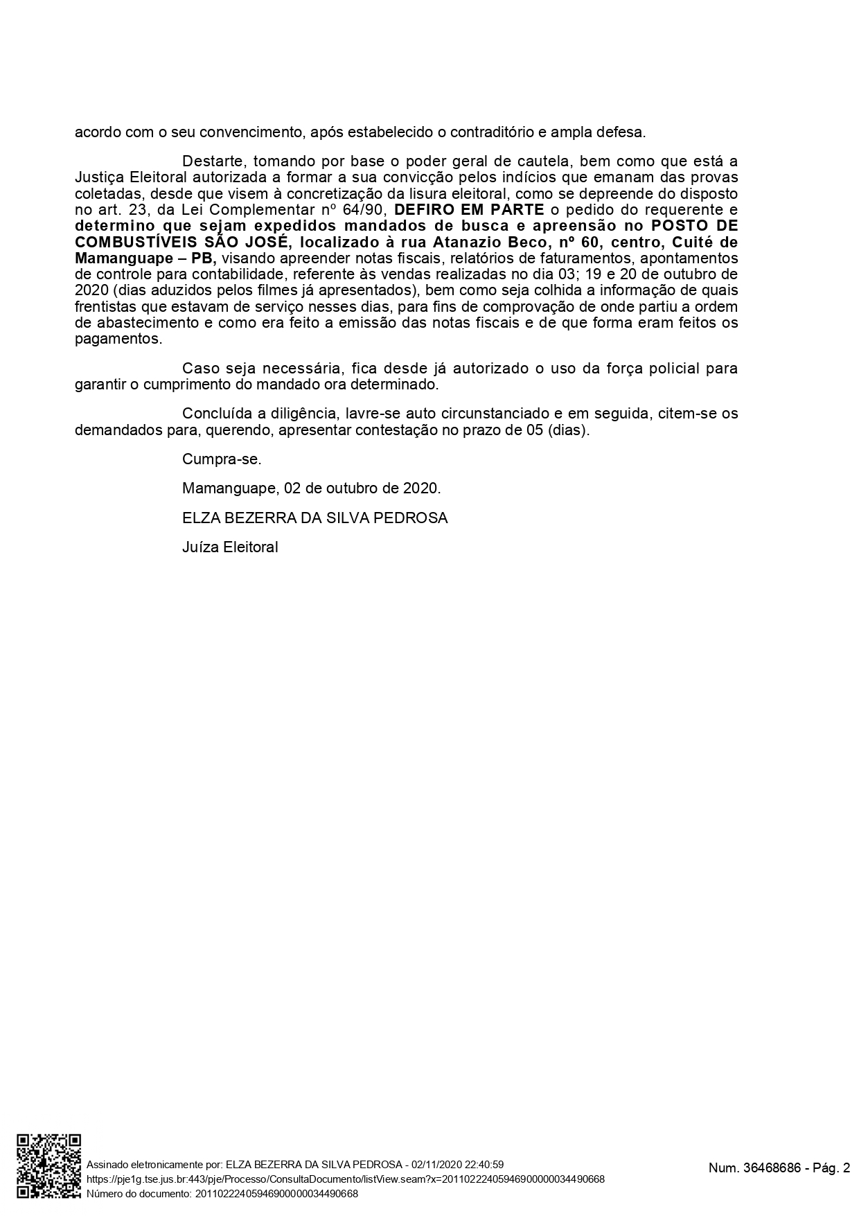 A juíza Elza Bezerra da Silva Pedrosa, da 7ª Zona Eleitoral de Mamanguape, determinou, por meio de medida cautelar, um mandado de busca e apreensão em um posto de combustível do município de Cuité de Mamanguape, no Litoral Norte do Estado, visando apreender notas fiscais e relatórios de faturamento afim de obter provas para instruir uma futura ação de investigação judicial eleitoral sob o argumento de que candidatos estão supostamente abusando do poder econômico e distribuindo combustível afim de que apoiadores participem de eventos de propaganda eleitoral.