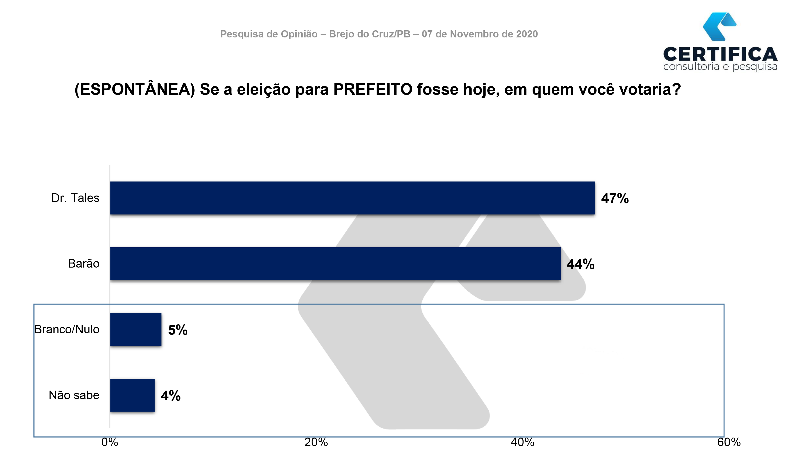 A pesquisa foi registrada no Tribunal Superior Eleitoral (TSE) sob o número: PB-03953/2020. A margem de erro máxima é de 5,6% para mais ou para menos, com uma confiança de 95%, isto implica que, considerando a margem de erro, a chance de o resultado obtido retratar os dados reais da população é de 95%.