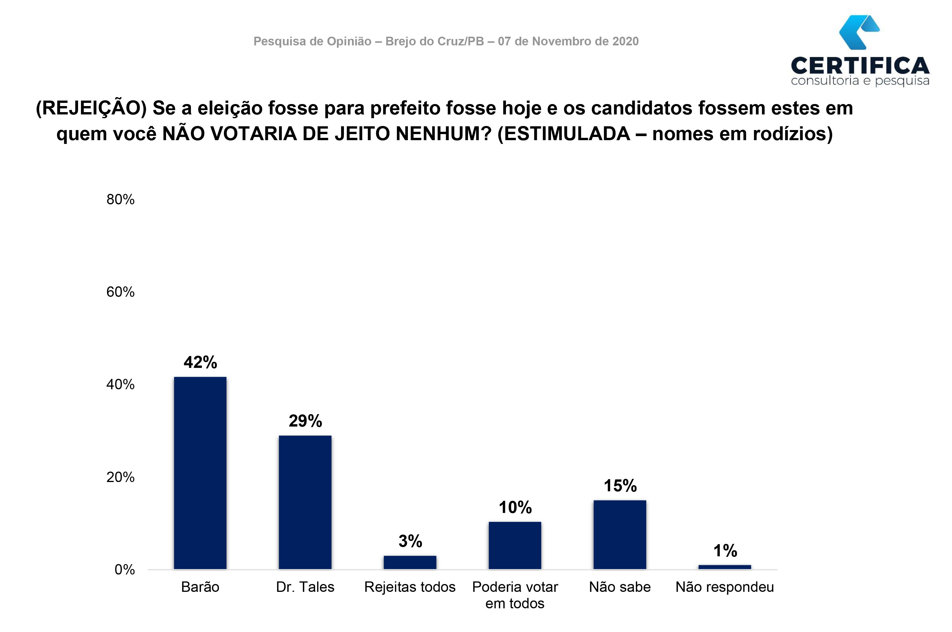 O Instituto Sigma Algebra / Certifica Consultoria entrevistou 300 eleitores de 21 localidades, entre bairros e comunidades das zonas urbanas e rural do município de Brejo do Cruz. São elas: Adecob, Bairros dos Estados, Balisa/Bom Jardim, Barragem, Brado Monte/Tabuleiro, Brejinho Totó, Centro, Com Olho Dágua Alves, Com Riacho Jardim, Com Tobibas, Emboca Marinheiros /Curral Queimada, Pau Darco/Lon, Populares, Santa Rosa de Cima/Tião Galinha, Três Meninas.