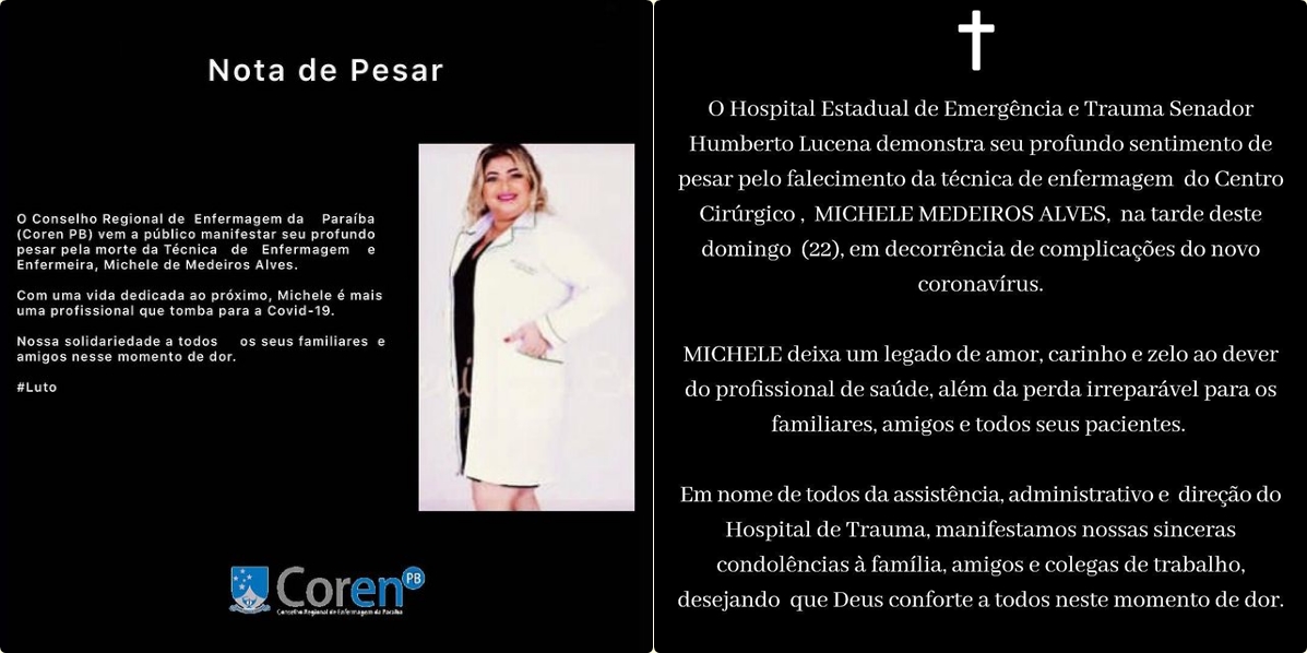 O Conselho Regional de Enfermagem da Paraíba (Coren-PB) e o Hospital de Emergência e Trauma de João Pessoa divulgaram notas de pesar pela morte da profissional de saúde.