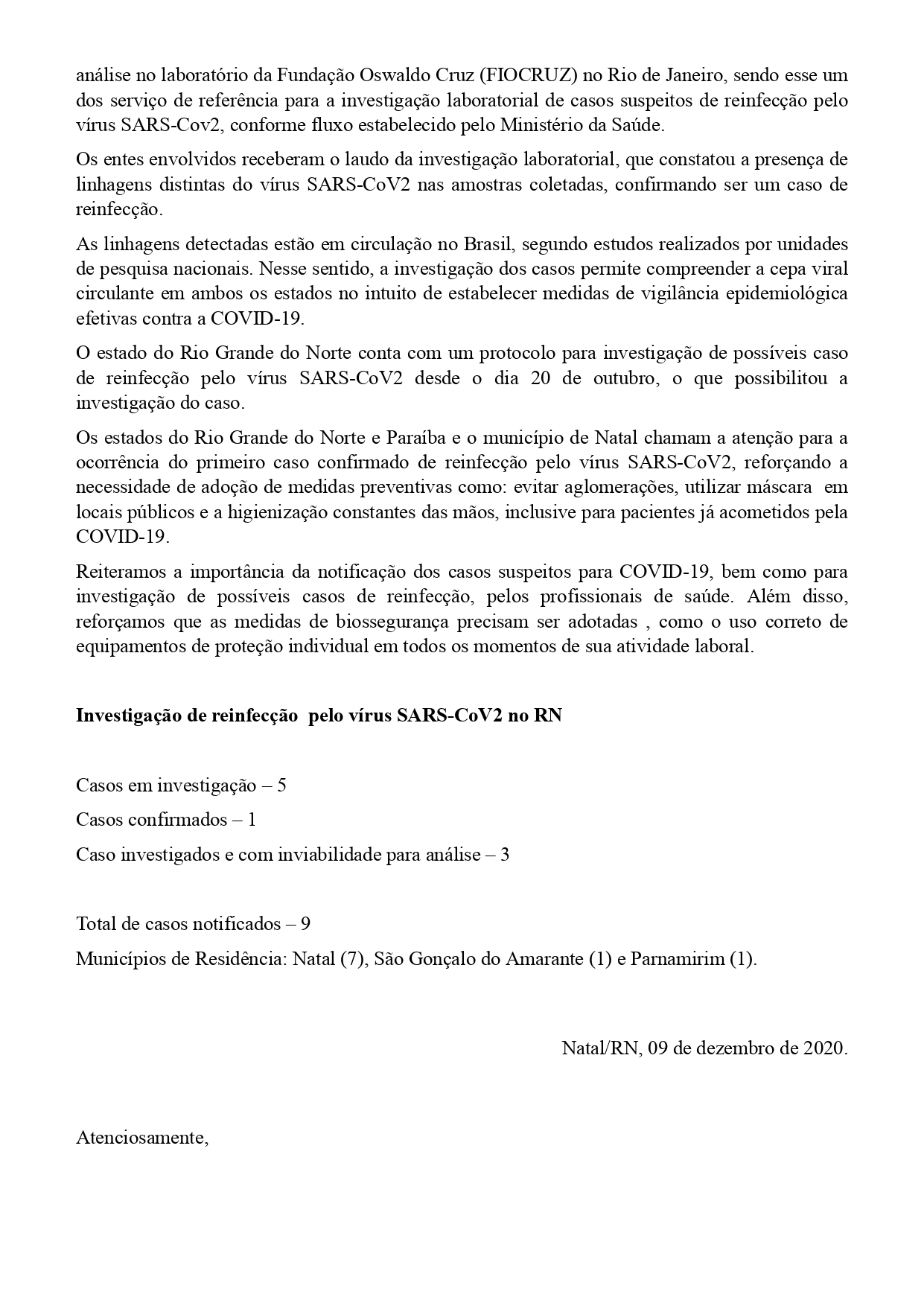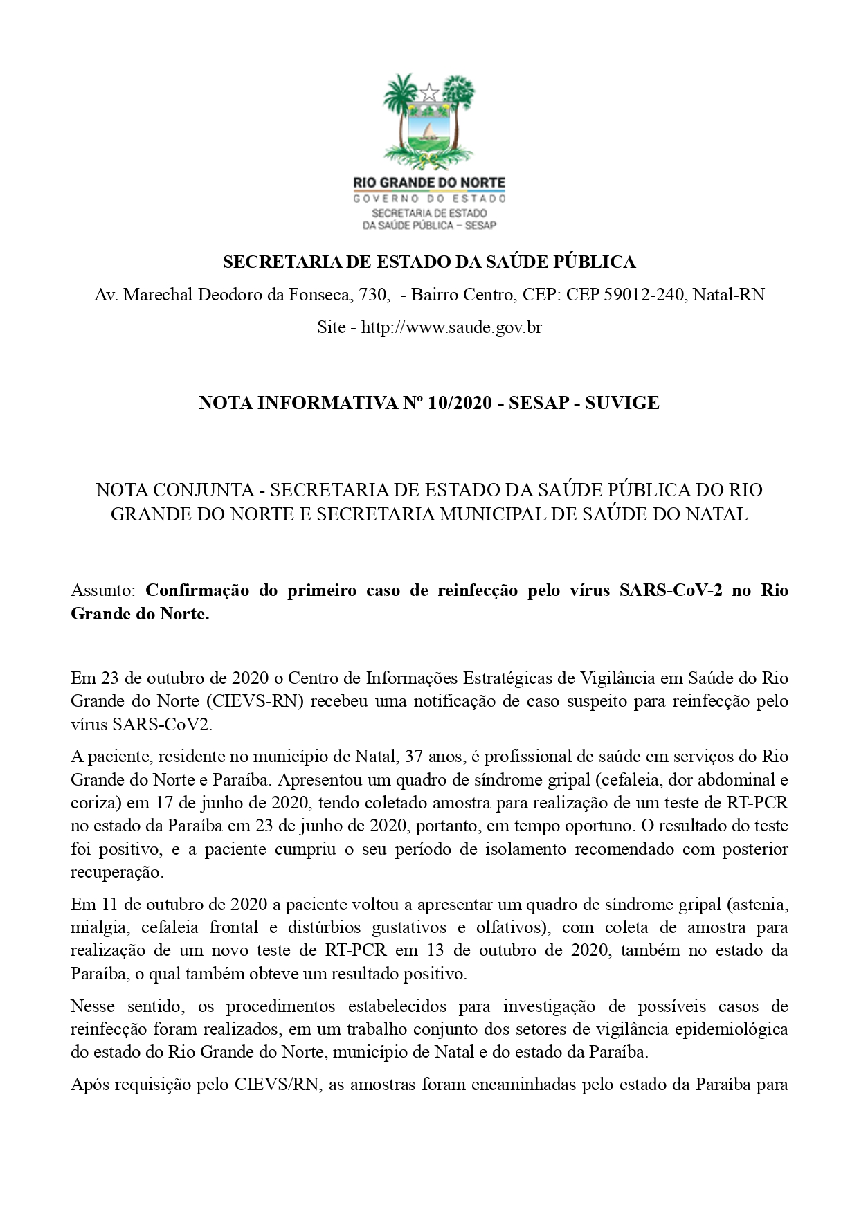 Nesse sentido, os procedimentos estabelecidos para investigação de possíveis casos de reinfecção foram realizados, em um trabalho conjunto dos setores de vigilância epidemiológica do estado do Rio Grande do Norte, município de Natal e do estado da Paraíba.