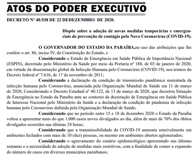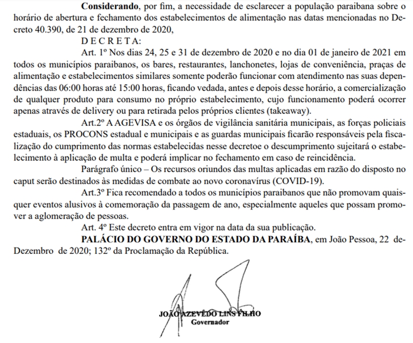 Ainda de acordo com a publicação, o descumprimento sujeitará ao estabelecimento comercial à aplicação de multa e poderá implicar ainda no fechamento em caso de reincidência. Fica recomendado, por fim, a todos os municípios paraibanos que não promovam quaisquer eventos alusivos à comemoração da passagem de ano, especialmente aqueles que possam promover a aglomeração de pessoas. O decreto já está em vigor.
