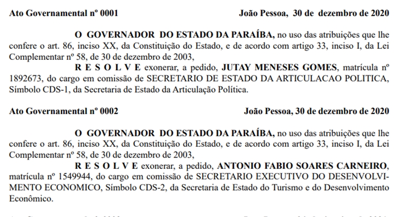 O governador da Paraíba João Azevêdo (Cidadania), em publicação no Diário Oficial, nesta terça-feira (5), exonerou os secretários de Estado da Articulação Política, Jutay Meneses Gomes, e Fábio Carneiro, secretário executivo do Desenvolvimento Econômico de suas pastas.