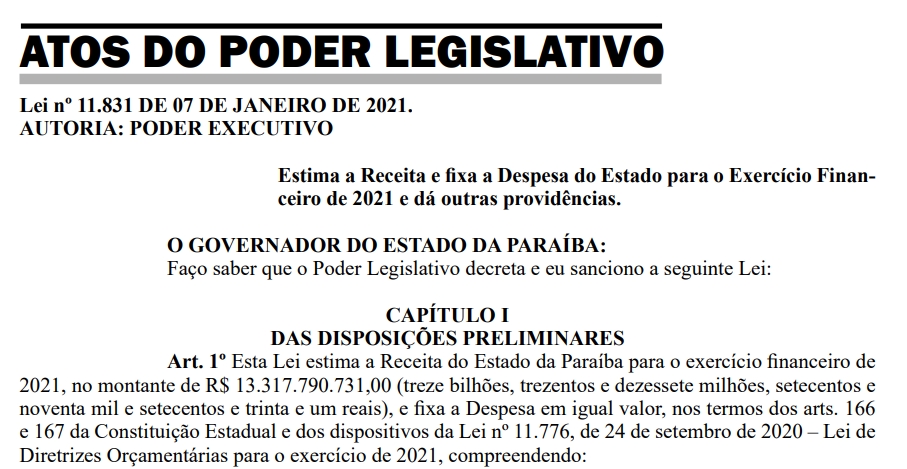 O governador da Paraíba João Azevêdo (Cidadania) em publicação no Diário Oficial do Estado (DOE) nesta sexta-feira (8), sancionou a Lei Orçamentária Anual para o exercício 2021, aprovada pela Assembleia Legislativa da Paraíba (ALPB). A peça orçamentária prevê um investimento de R$ 13,3 bilhões, incluindo todas as receitas.
