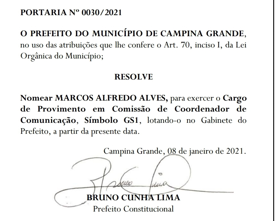 O prefeito Bruno Cunha Lima assinou portaria, nesta sexta-feira (8), nomeando o jornalista Marcos Alfredo Alves, 55, coordenador de Comunicação do Município de Campina Grande.