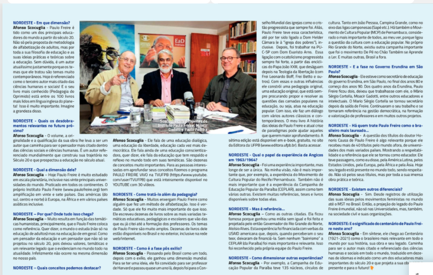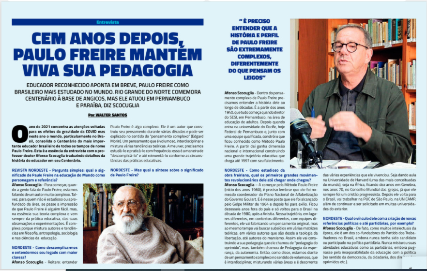 Na entrevista, Afonso Scocuglia destaca com riqueza de detalhes por que Paulo Freire é considerado o patrono da educação brasileira e o pedagogo mais estudado do mundo. Ele também revela o trabalho do ilustre pedagogo em Estados nordestinos.