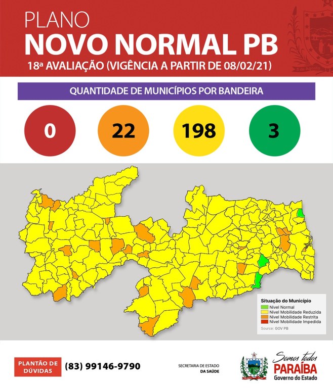 Governo da Paraíba publicou, neste sábado (6), a 18ª avaliação do Plano Novo Normal Paraíba que passa a vigorar a partir desta segunda-feira (8). O documento aponta que 89% das cidades paraibanas (198) estão classificadas na cor amarela; 22 municípios devem ter a mobilidade restrita, uma vez que estão classificados em bandeira laranja; e os municípios de Mogeiro, Natuba e Baía da Traição são os únicos classificados na bandeira verde. Não há municípios avaliados na bandeira vermelha, cuja cor indica mobilidade impedida.