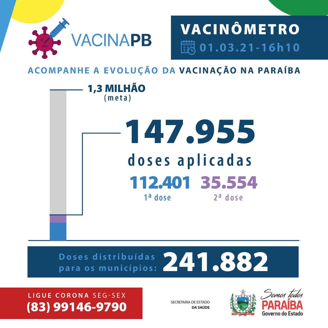 Foi registrado no sistema de informação SI-PNI a aplicação de 147.955 doses. Até o momento, 112.401 pessoas foram vacinadas com a primeira dose e 35.554 com a segunda dose da vacina.