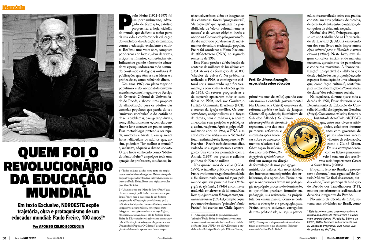 A nova edição da Revista NORDESTE, de número 169, está disponível nas bancas e também para leitura no modo virtual (CLIQUE AQUI para acessar). Uma das matérias de maior repercussão é sobre o centenário do educador pernambucano, Paulo Freire, hoje, cidadão do mundo, que dedicou a maior parte da sua vida a combater pela educação dos excluídos da educação sistemática, contra a educação excludente e elitista. O texto é assinado pelo professor paraibano Afonso Scocuglia.