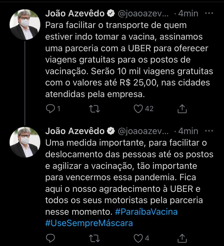 O governador da Paraíba João Azevêdo anunciou em suas redes sociais, na tarde desta segunda-feira (22), que firmou uma parceria com a empresa Uber, de motoristas por aplicativo, para realizar o transporte das pessoas até os pontos de vacinação de forma gratuita, com agilidade e segurança.