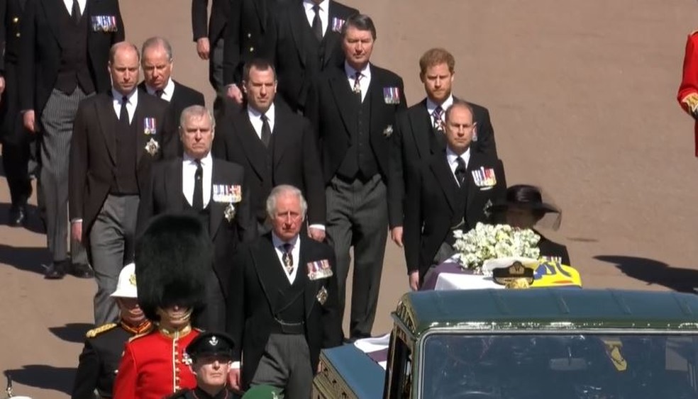 Atrás do caixão ficaram o príncipe Harry à esquerda, Peter Phillips – filho da princesa Anne – ao centro, e príncipe William à direita.