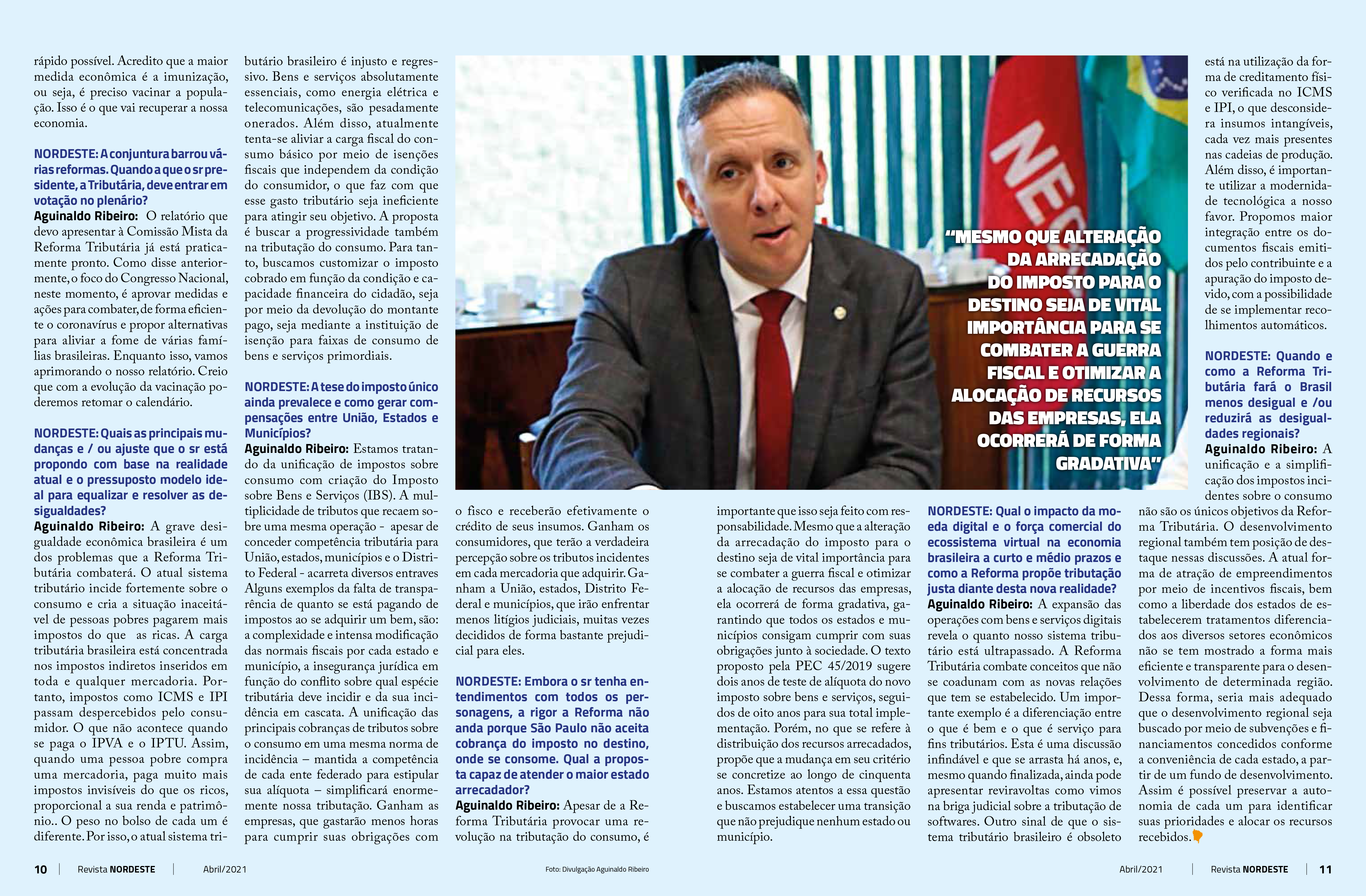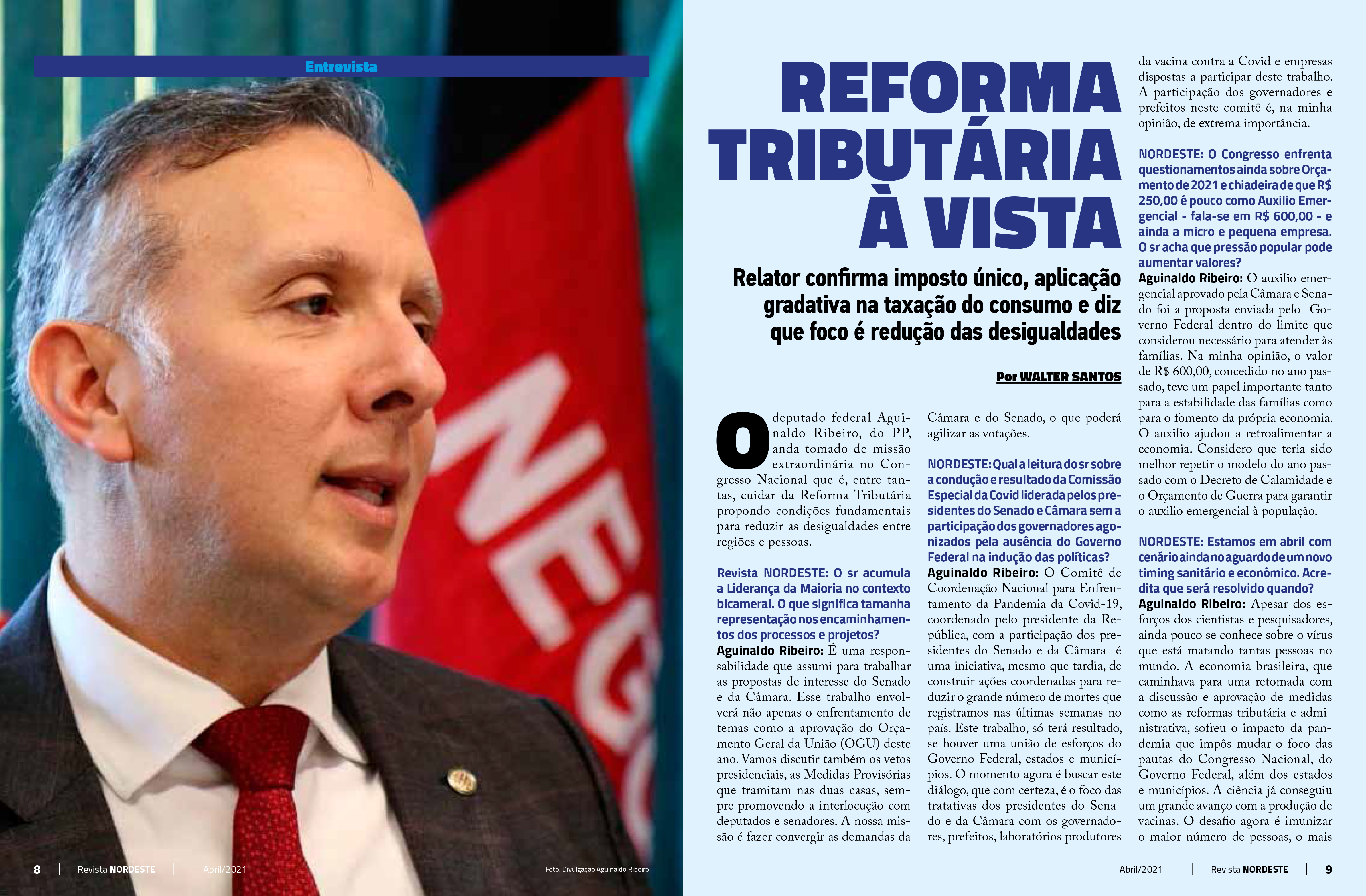 Com o projeto de Reforma Tributária prestes a avançar no Congresso Nacional, o relator da matéria e atual líder da Maioria na Câmara Federal, o deputado Aguinaldo Ribeiro (PP), falou com exclusividade à Revista NORDESTE sobre a análise e discussões em torno da matéria.