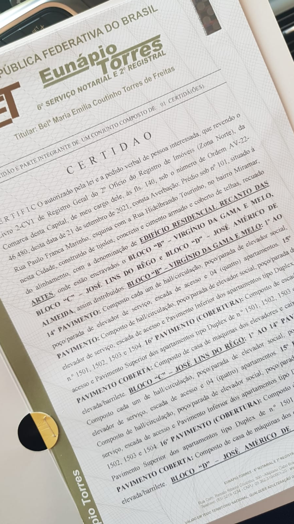 O advogado dos adquirentes, Daniel Braga, especialista em Direito Imobiliário, informa que hoje, 22/09/2021, a averbação da construção foi devidamente formalizada perante o Cartório Eunápio Torres. A seguir, certidão comprobatória:
