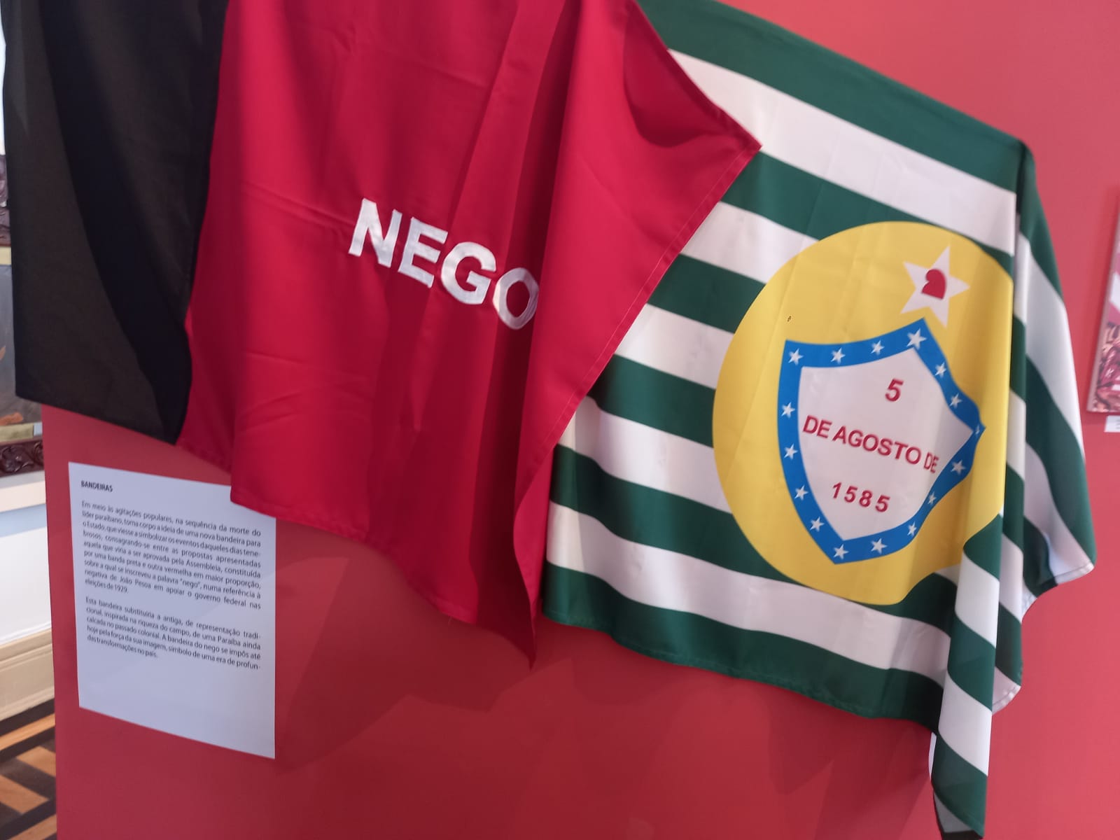 Por trás deste ambiente, depara-se com as bandeiras, a primeira oficial depois a do NEGO, e imagens do fato histórico que mudou o rumo da Paraíba e do País.