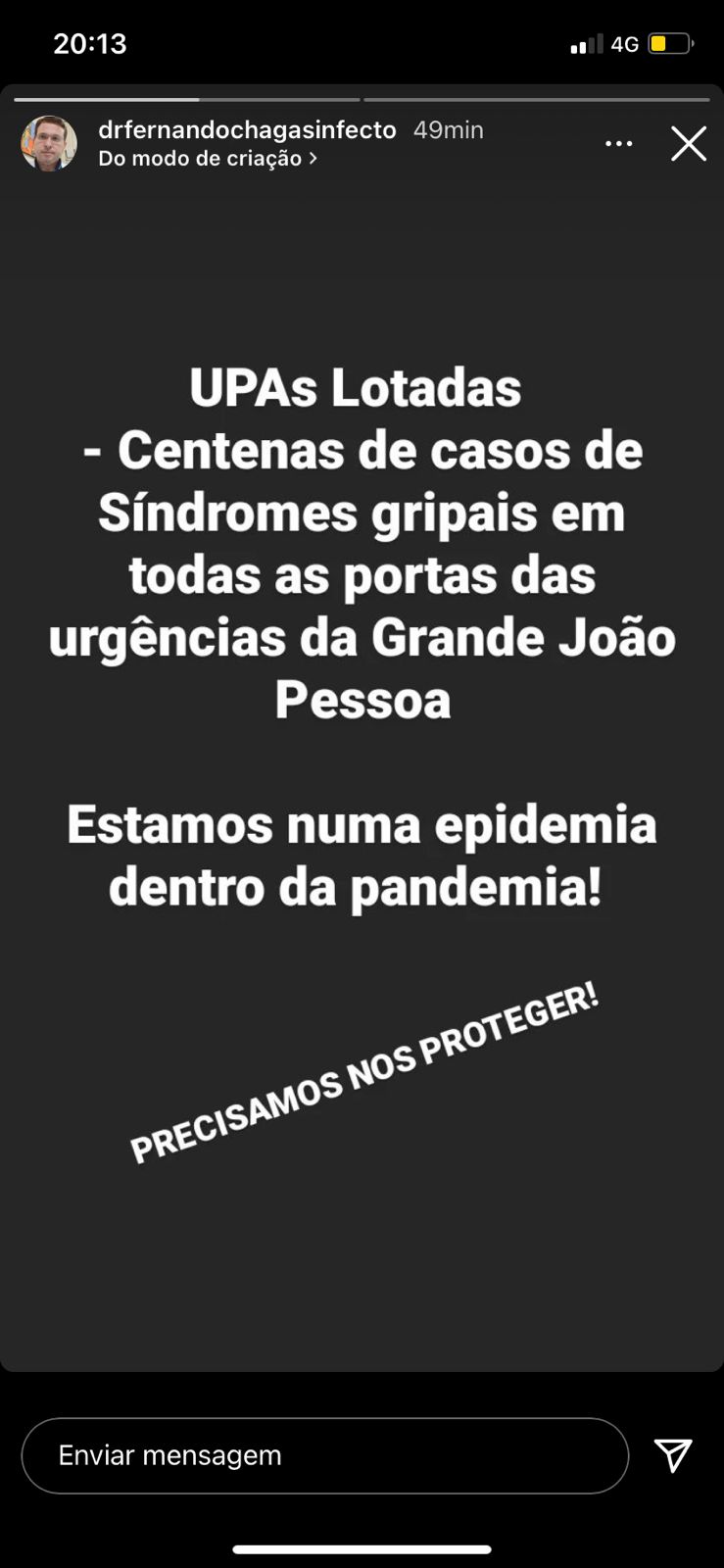 O diretor geral do Complexo Hospitalar de Doenças Infectocontagiosas Clementino Fraga, o infectologista Fernando Chagas alertou a população neste sábado (25), através das redes sociais, para um surto de gripe na região metropolitana de João Pessoa. Segundo o médico, as Unidades de Pronto Atendimento da capital estão lotadas de pacientes infectados pelo vírus influenza.