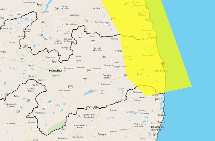 O alerta amarelo do Inmet de perigo potencial de chuvas intensas é válido para João Pessoa e mais 58 municípios da Paraíba, com vigência até as 10h da quarta-feira (12).