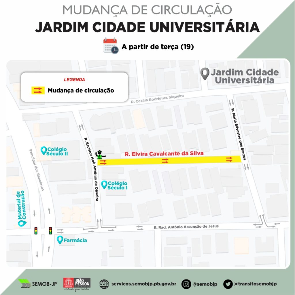 Para promover mais mobilidade ao trânsito no bairro Jardim Cidade Universitária, principalmente nos horários considerados de pico, a Superintendência Executiva de Mobilidade Urbana (Semob-JP) vai realizar, na próxima terça-feira (19), uma mudança de circulação na Rua Elvira Cavalcanti da Silva. Com a intervenção, a via passará a ter sentindo único, saindo da Rua Escritor Noé Antônio de Oliveira até o cruzamento com a Rua Maria Silvestre dos Santos.