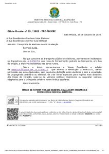 A Corregedora Regional Eleitoral do TRE-PB, desembargadora Maria de Fátima Moraes Bezerra Cavalcanti Maranhão, emitiu ofício nesta sexta-feira (28) com recomendações aos juízes eleitorais sobre normas de transporte gratuito de eleitores no segundo turno das Eleições 2022, no próximo domingo (30).