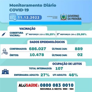 A Secretaria de Estado da Saúde (SES) registrou, neste domingo (11), 889 casos de covid-19. Entre os casos confirmados, 03 (0,34%) são moderados ou graves e 886 (99,66%) são leves. Agora, a Paraíba totaliza 686.027 casos confirmados da doença, que estão distribuídos por todos os 223 municípios.