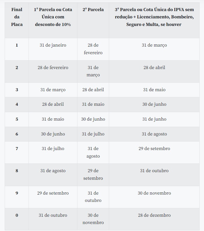 A data de vencimento com desconto varia de acordo com o número da placa e vai até 31 de outubro para veículos com a placa 0.