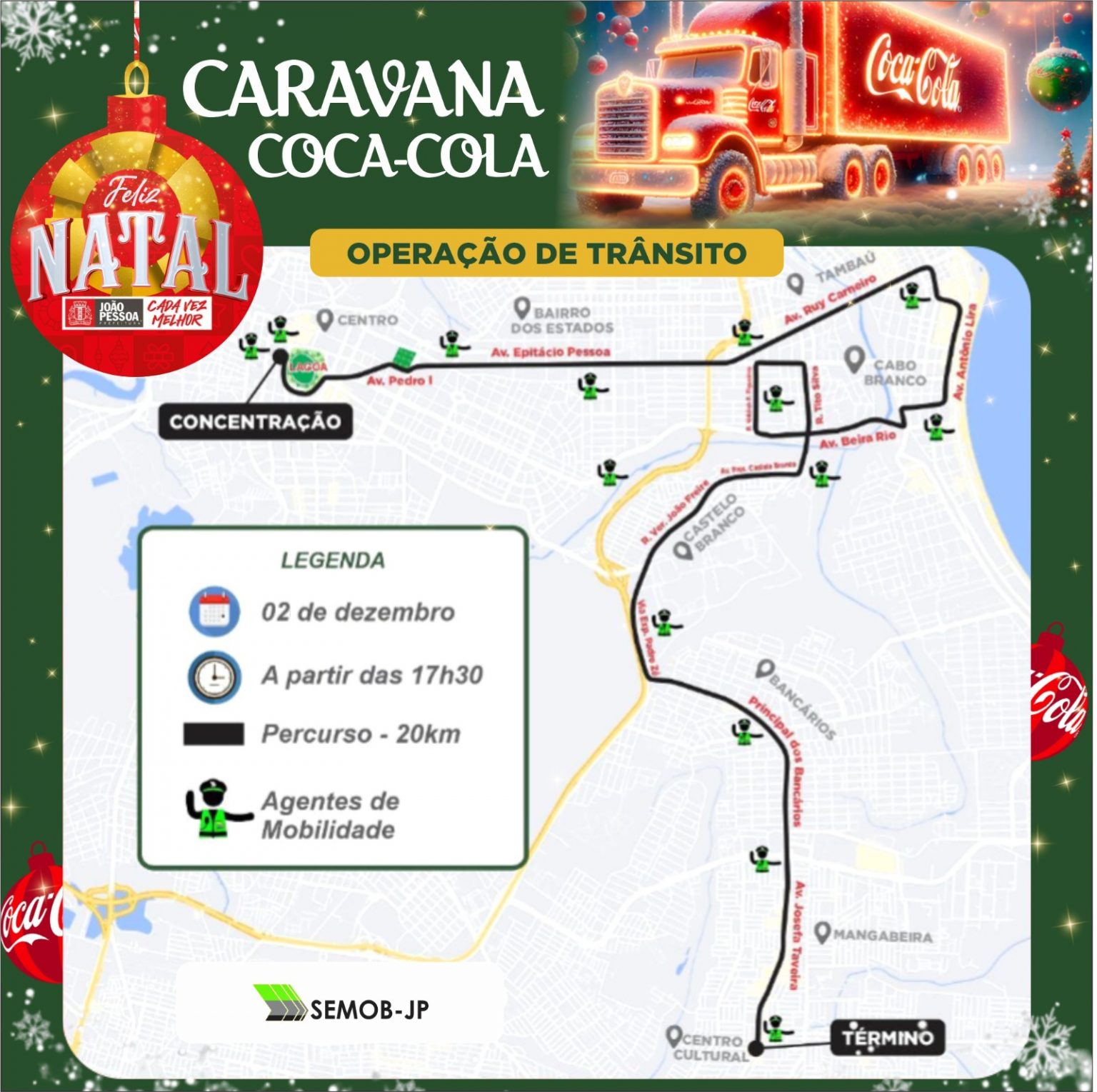 Para garantir a segurança viária dos espectadores e a mobilidade no entorno do trajeto por onde vai passar a Caravana da Coca-Cola, evento que integra a Programação do Natal da Prefeitura de João Pessoa e será realizado neste sábado (2), agentes da Superintendência Executiva de Mobilidade Urbana (Semob-JP) estarão promovendo bloqueios necessários, no percurso total de 20 quilômetros, desde a concentração no Parque Solon de Lucena até a chegada dos caminhões ao bairro de Mangabeira.