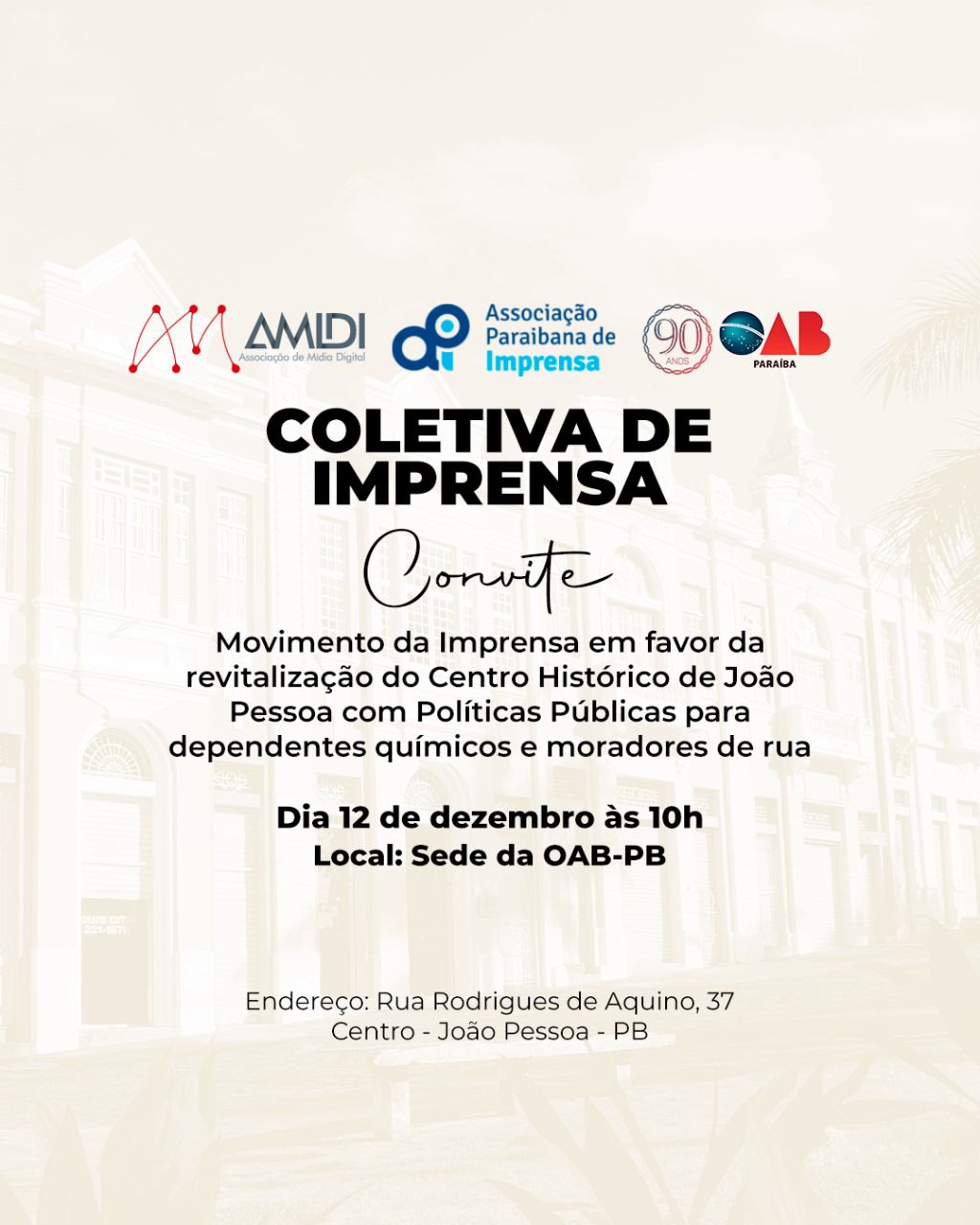 Uma coletiva de imprensa será realizada na próxima terça-feira (12) para discutir a implementação de políticas públicas para dependentes químicos e moradores de rua em João Pessoa, na perspectiva de contribuir para a revitalização do Centro Histórico da capital.