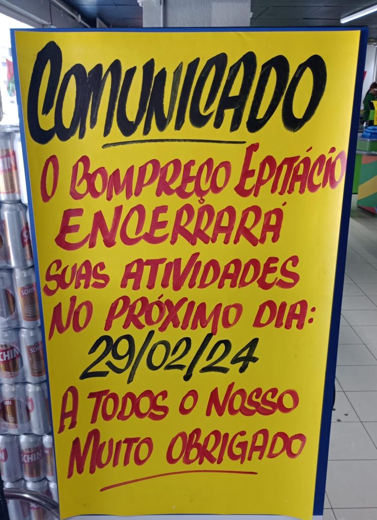 “O Bom Preço Epitácio encerrará suas atividades no próximo dia: 29/02/24. A todos, o nosso muito obrigado”, diz o comunicado.